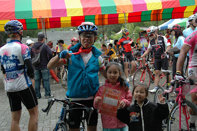 在一個上坡右轉處,突然聽到學姐大喊,小櫻桃加油!我還被嚇一下,本以為今天會下雨,在身上小櫻桃車衣外,還加穿了件背心,不過還是被認出來;至於為什麼這 次我自己個人報名也穿小櫻桃隊衣,因為是這一陣子身心煎熬,導致爆瘦兩、三公斤,之前買的車衣全部大一號,只剩最新買的小櫻桃車衣最合身,真是件令人困擾 的事。沒多久,一台車開到我身邊,有人喊我名字,居然看到是阿誠坐在他們車隊補給車副駕駛座上,我問他說:你怎不騎?他說:一出發沒多久,鍊條就斷了,十一速沒人有打鍊器,直接被隊車收容。真是可憐的精英阿誠!跟他要罐水來喝,把我車上一罐快喝完的水壺跟他換瓶水壺,心裡還想,是不是要感謝一下你斷鍊,讓我賺到一次動態補給,看他滿臉X意,這句話終究說不出口。