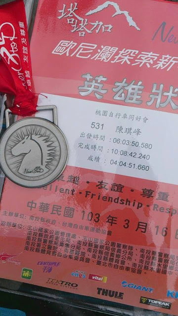 終於看到夫妻樹,看車錶時間都快四小時了,怎麼今年騎這麼慢,前年騎NS塔塔加都還有三小時四十七分的,最近這幾個月練跑時間比較多,車子比較少騎,腿力還退步真多啊!剩一、兩k,依慣例把車上兩罐水全部擠光,作最後奮力一搏,能快多少算多少!右轉過終點拱門那一瞬間完成這場自我挑戰賽。仔細看成績證明,果不其然成績退步了,難過嗎?是有一點點。不過更開心的是,我對於騎車熱情還是不變啊!騎著我的愛駒『小藍拔拔號』繼續奔馳在山道間,管它騎的快或慢!103.03.16(日)