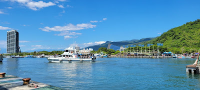 跑完第一天的特跑行程,禮拜六晚上入宿在烏石港遊艇碼頭旁新落成的大飯店。隔天一早,在飯店餐廳吃過美味的早餐後,大家在飯店門口前集合,一起走去碼頭搭船。從烏石港搭船到龜山島航程約要三十分鐘。船一開出碼頭,一望無際的海景,藍天白雲、海天一色、海風吹拂、心曠神怡,不知不覺心情都特別好了起來。大家紛紛拿起手機在船上拍個不停。跟老婆倆人走到船頭朝龜山島一起合拍。家裡兩個小孩現在都長大了,跟老婆重溫一下坐船旅遊也不錯。記得十九年前,我們的蜜月旅行到印尼峇里島自由行八天,其中有一天也是搭著遊艇出海去浮潛、戲水。