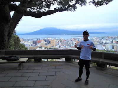 在這小公園繞了一圈,開始爬坡往城山跑去。城山公園步道是鋪上碎石子的石頭路,每隔一段距離設置一塊木頭橫桿防止碎石子滑動。我覺得這設計蠻好的,滲水性佳又可以不像爬階梯般吃力。路上遇到幾位早起爬山的歐基桑、歐巴桑,用僅會的幾句日語跟她們互相微笑打聲招呼、說聲早安。城山不高,標高約一百出頭公尺,卻是鹿兒島市區最高的地方。才十來分鐘便跑到城山公園的展望台,這裡是瞭望櫻島的好地方,可惜今天天氣陰沉沉、雲層很厚,看樣子只有前天禮拜天那天,是這幾天天氣最好的日子。剛好旁邊有一位正在用腳架拍攝櫻島的攝影師,請他幫我拍張照,他突然冒出一句中文:你台灣來的吧?後來跟他聊聊才知道,他是香港來的跑友,前天也有跑鹿兒島馬,今天特地早起上來城山拍櫻島,真是有夠巧的。離開展望台,左轉跑出步道接到柏油路跑下山。