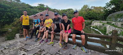 快到首里城前,有幾段緩坡,這時天色也完全亮了。走一走、等一下後面落後的兔友。原本計畫從首里城下方龍潭池旁的步道跑上,結果步道被先前颱風吹斷的大樹枝擋道、整條步道封閉,只好再繞回馬路上首里城。來到了首里城守禮門,拿起手機拍張大合照。首里城的宮殿因為前幾年的一場火災,目前正在修復中,所以連帶首里城中有很多段步道也跟著封閉,實在是可惜,不過這也沒辦法。到了円鑑池這邊,我們在天女橋這座小拱橋像遊客般到此一遊拍照,小池塘中間是弁財天堂,可能是一大早的關係,都沒人,感覺這裡特別幽靜,就我們這群最吵。之後從すーじぐゎー小巷子到29號道路右轉準備回程。